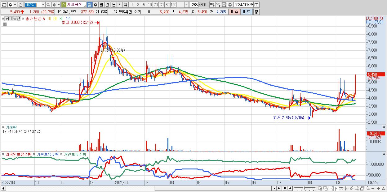 - 케이옥션 (5,490원 ▲ 29.79% , 시총: 1,495억, 거래량: 19,341,357, 거래대금:946억)