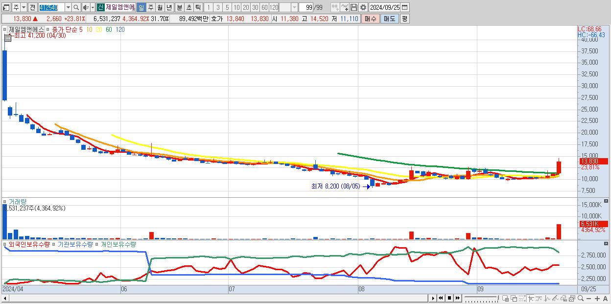 - 제일엠앤에스 (13,830원 ▲ 23.81% , 시총: 2,849억, 거래량: 6,531,237, 거래대금:895억)