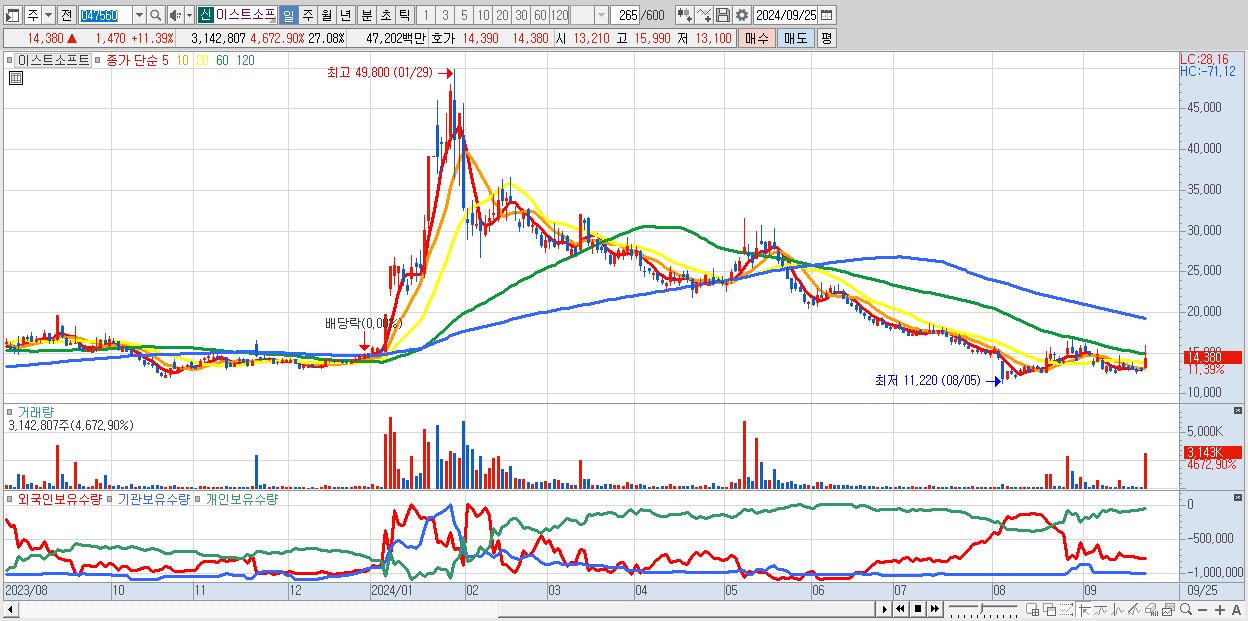 - 이스트소프트 (14,380원 ▲ 11.39% , 시총: 1,669억, 거래량: 3,142,807, 거래대금:472억)