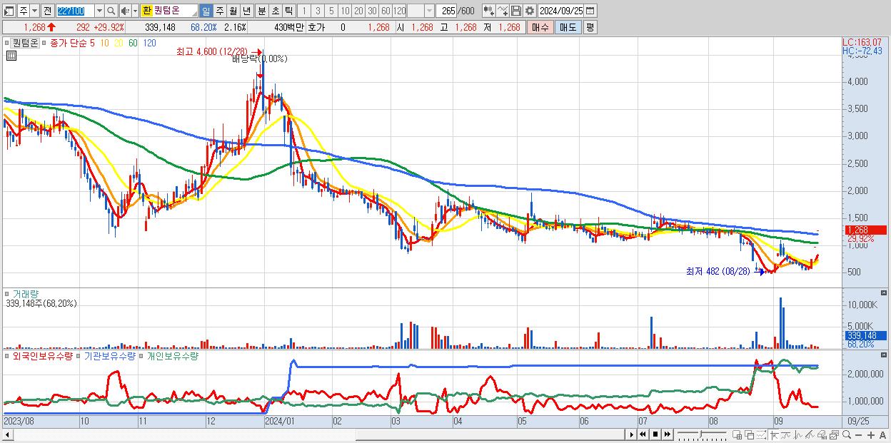 - 퀀텀온 (1,268원 ▲ 29.92% , 시총: 199억, 거래량: 339,148, 거래대금:4억)