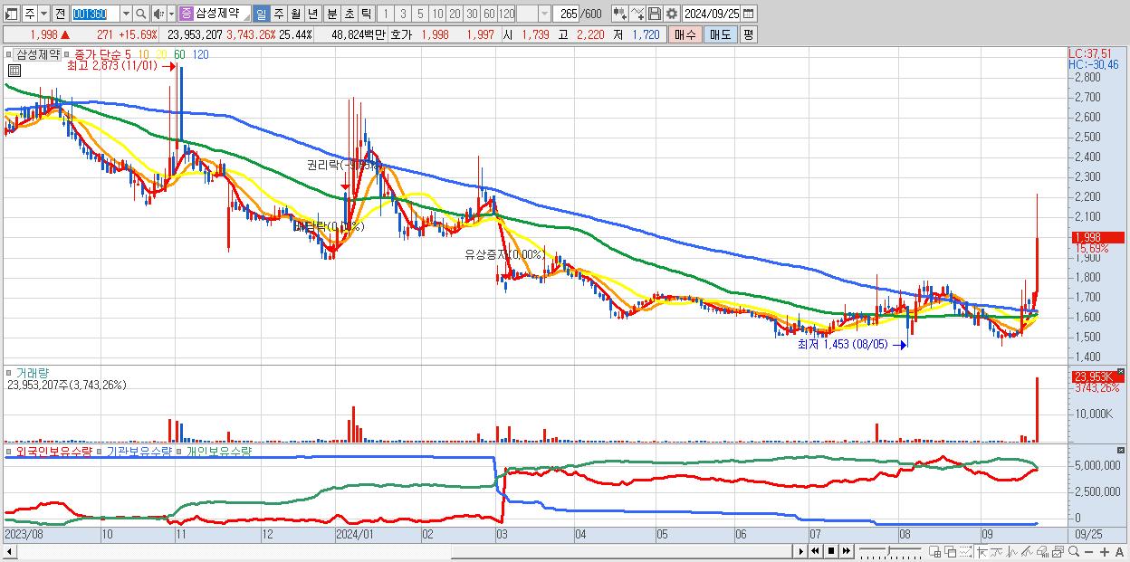 - 삼성제약 (1,998원 ▲ 15.69% , 시총: 1,881억, 거래량: 23,953,207, 거래대금:488억)